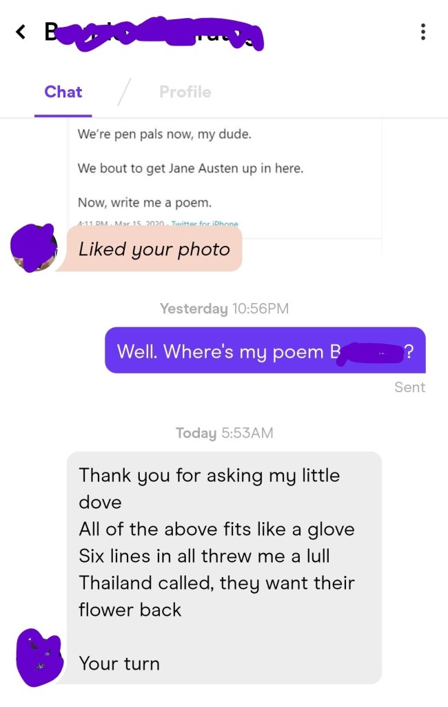 Okay so I didn’t even have any time to respond to B because he unmatched from me shortly after I took this screenshot. I wondered briefly what would prompt someone to write a poem, ask for one back, and then remove any possibility of further connection. But then I remembered that his profile said he was “conservative”, and my linked Instagram account has a bunch of pictures from the last pro-abortion rally I went to outside of the Supreme Court. So… perhaps that? ¯\_(ツ)_/¯