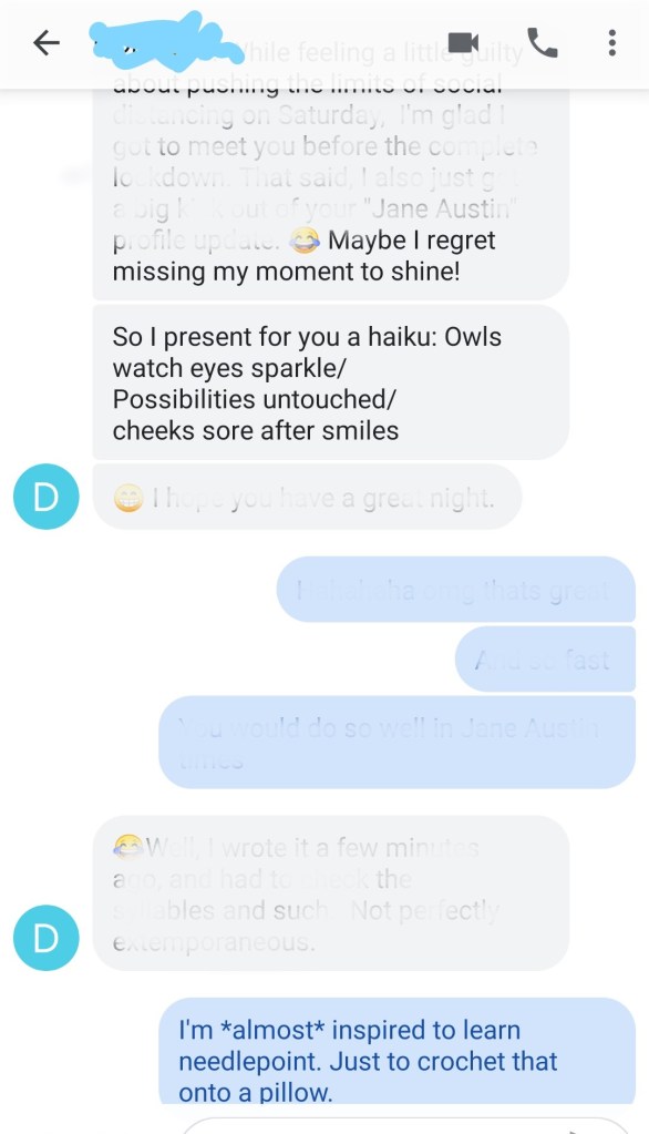 The place where he and I met for a drink had a few owl statues behind the bar, which I pointed out to him as local landmarks. So he gets points for incorporating that little tidbit. Also we DEFINITELY DIDN’T TOUCH AT ALL per my instance. Back on March 14th, that mentality seemed paranoid and so he clearly felt the need to reference that as well. Also I don’t like hugs, so this has been a great reason to tell people not to touch me.