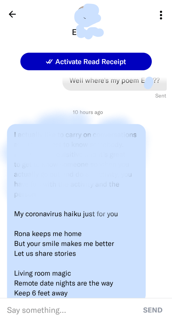 That being said, I find E’s pair of haikus to be fairly charming. Aside from the faux pas of rhyming “way” with “away”, his message makes sense. Stressing the importance of staying 6 feet away while still finding a way to cultivate relationships – that’s our new normal after all.