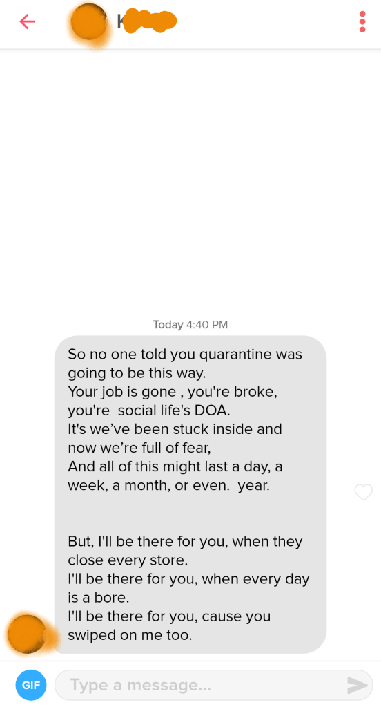 Creative artsy-fartsy dudes are consistently the most reliable for some decent prose. I can typically spot them based on their profile right away. Intentionally lopsided haircuts, record collection on display, ironically nerdy glasses, probably has a linked Instagram account full of his artwork. Or his band. Or his tattoos.