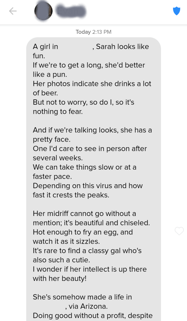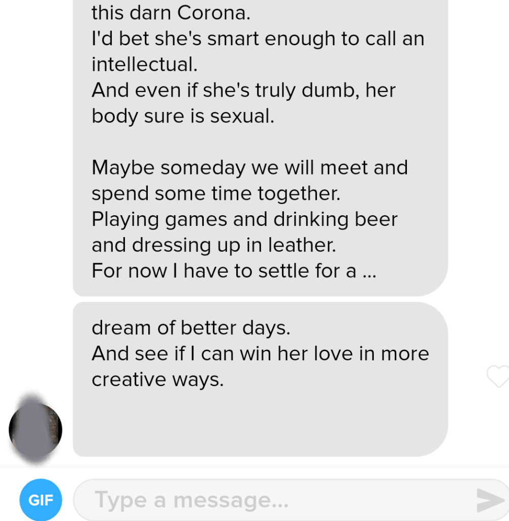 I almost didn’t share this one because it reveals a lot of personal information about me, right down to my specific neighborhood, which is TMI. Also points out the fact that I wear crop tops in one (okay maybe two) of my Tinder pictures because DUH SEX SELLS. Although given the amount of stress-eating I’m doing, combined with my gym closure, I think any trace of muscle definition I once had will certainly be gone by the time we’re allowed out again.